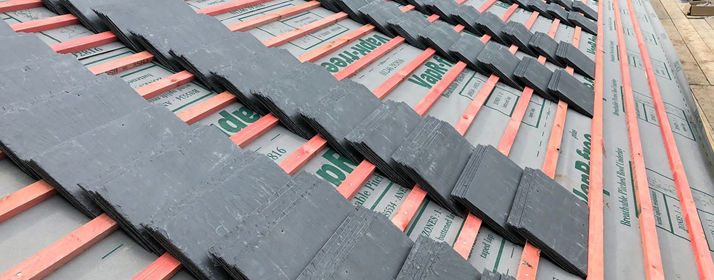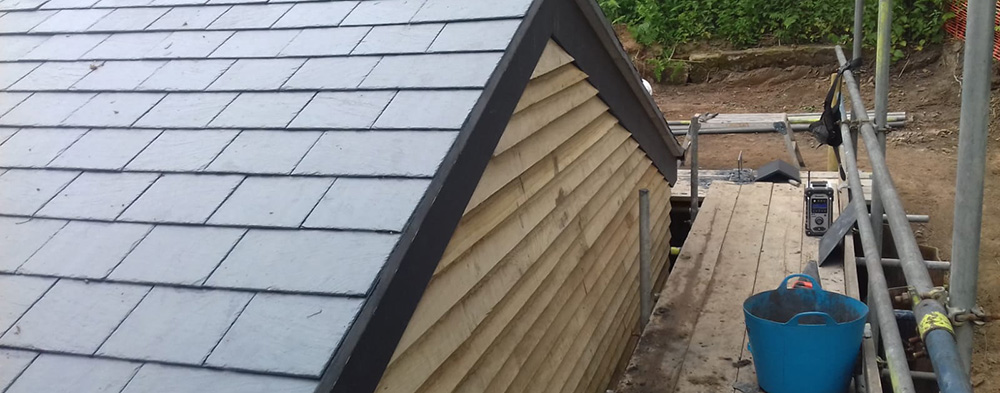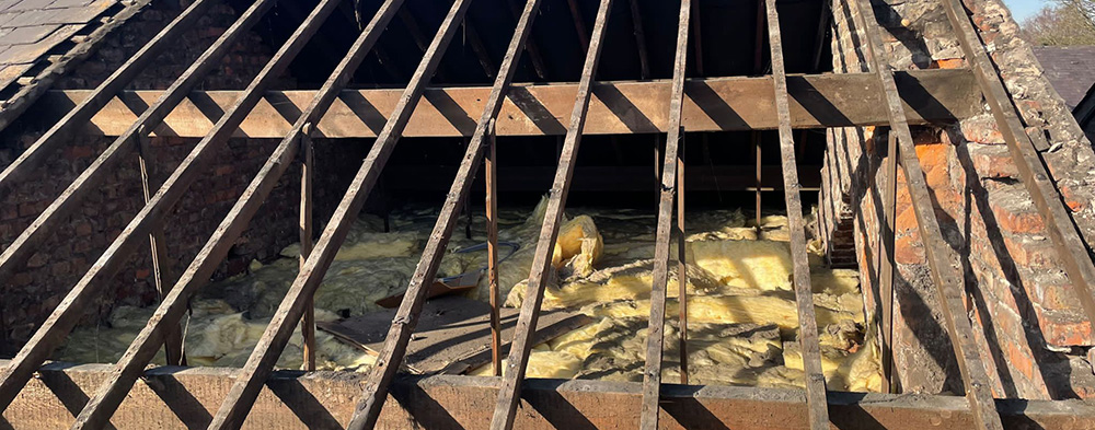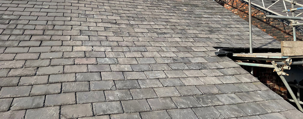 Complete dismantle remove old roof new timbers new slate roof.