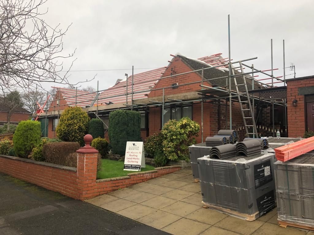 Complete Re roof on 2 adjoining bungalows on Alan Avenue, Failsworth. Double Roman tiles in grey were on this project along with dry ridge kit system.